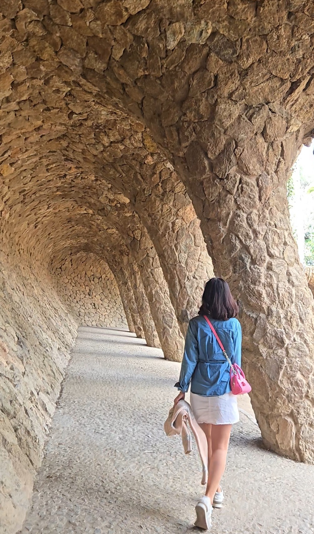구엘공원의 가장 큰 매력은 '자연과 예술의 만남'에 있습니다. 공원을 설계한 가우디는 자연의 형상을 그대로 본떠 건축을 만들었고, 그 결과는 놀라울 만큼 조화롭습니다. 돌로 만든 계단은 마치 산책로처럼 자연스럽게 이어지고, 벤치와 기둥은 나무와 식물과 함께 숨을 쉬는 듯한 느낌을 줍니다. 이러한 설계는 단순히 외형적 미 뿐만 아니라 기능적인 측면에서도 탁월합니다. 경사진 지형을 그대로 살린 길들은 방문객이 무리 없이 이동할 수 있도록 설계되었고, 그 위로 비치는 햇살은 자연스러운 그림자를 만들어내며 풍경에 생동감을 더합니다. 개인적으로 가장 인상 깊었던 장면은 곡선형 벤치에 앉아 도시를 내려다보던 순간이었습니다. 따스한 햇살과 선선한 바람, 눈앞에 펼쳐진 붉은 지붕과 바다의 조화는 말로 표현하기 어려울 정도로 아름다웠습니다. 많은 관광객들이 있었지만, 그들 모두가 이 공간의 일부분처럼 느껴졌습니다. 아이들은 자유롭게 뛰어놀고, 커플들은 손을 꼭 잡고 조용히 거닐며, 혼자 여행 온 이들은 풍경에 몰입해 자신만의 감성을 기록하고 있었습니다. 구엘공원은 단지 '공원'이 아닌, 누구나 예술가가 되고 감상자가 되는 열린 공간이었습니다.