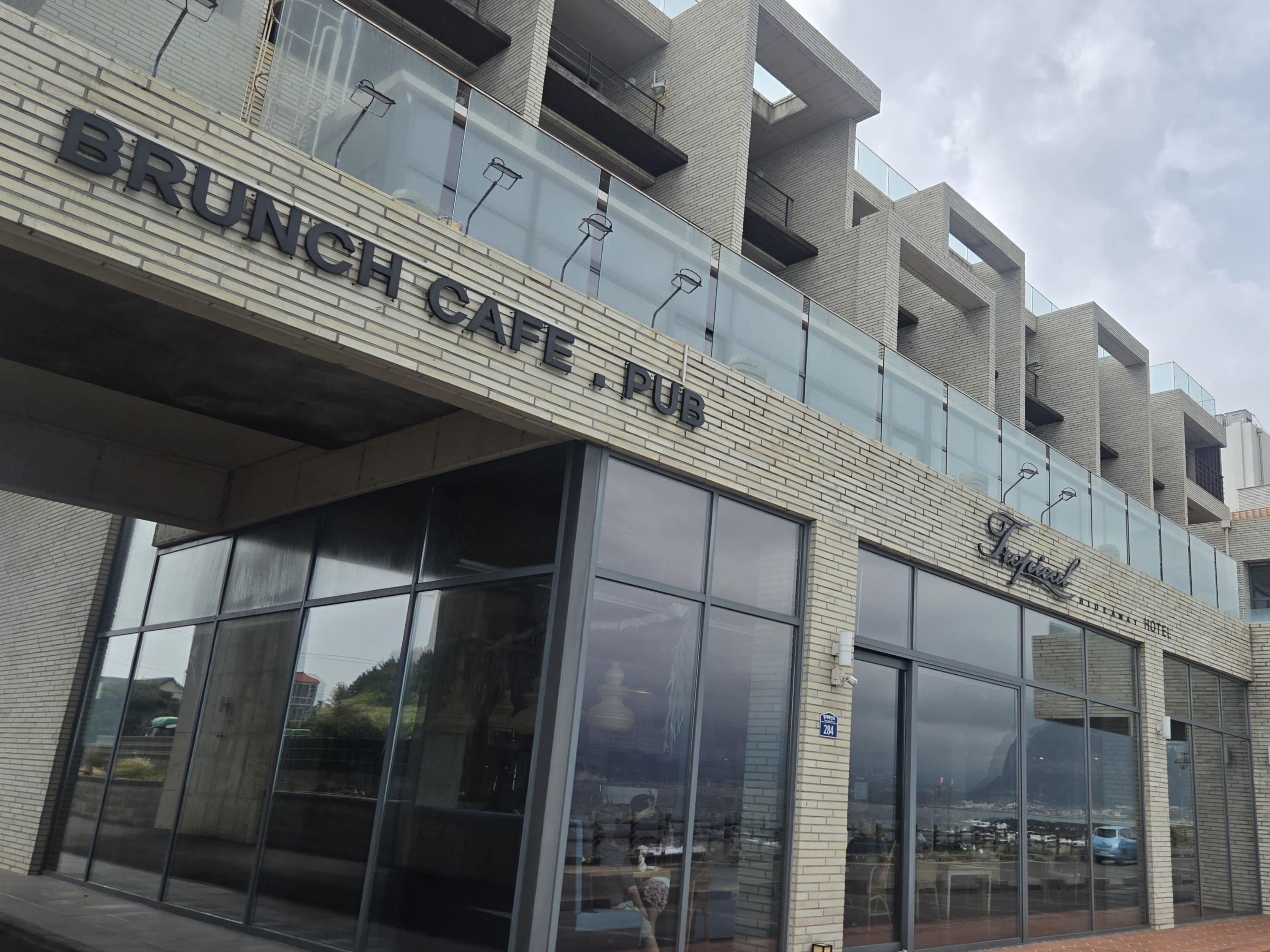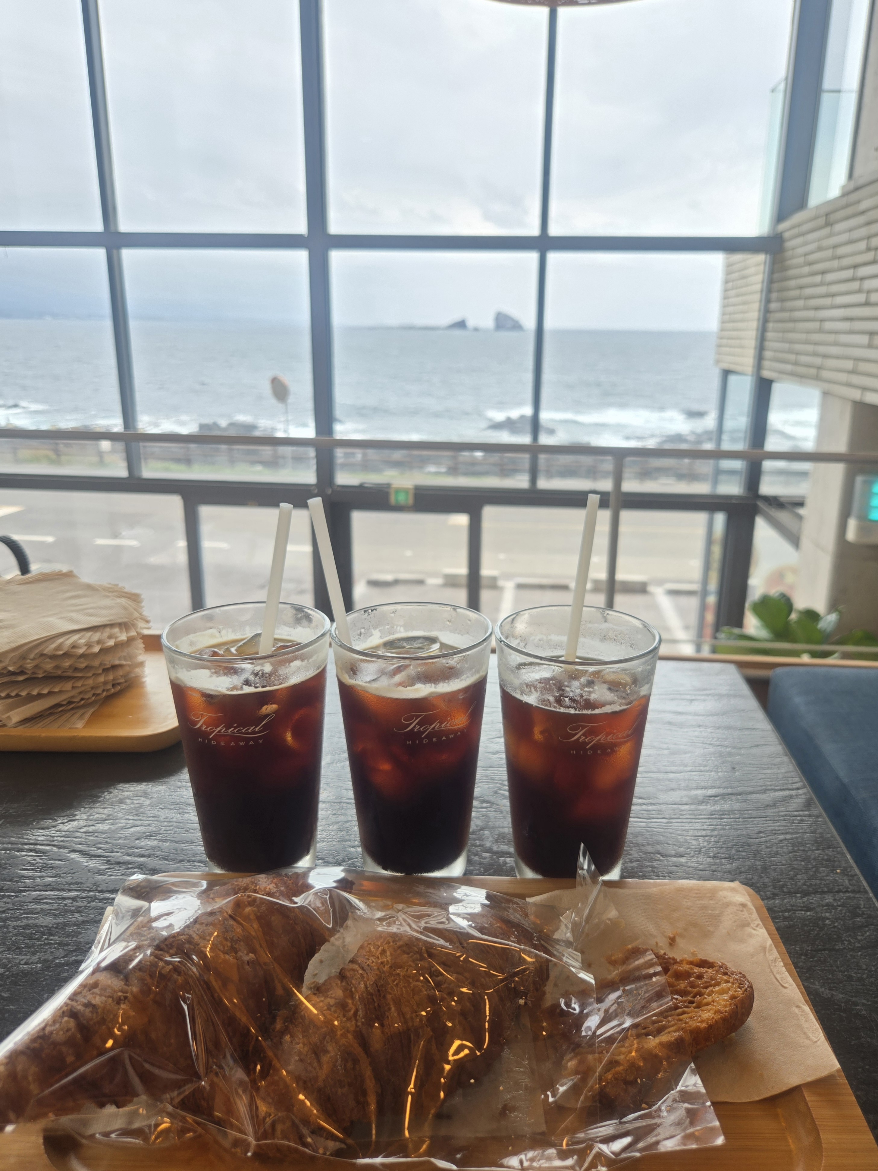 “아, 이제 커피 없으면 못 버티겠다”라는 친구의 말에 저희는 곧장 제주친구의 추천으로 트로피컬 하이드어웨이로 향했습니다. 카페 문을 열자마자 “와아…”라는 탄성이 동시에 터져 나왔습니다. 통유리 너머로 보이는 바다와 형제섬 한눈에 들어오는데, 마치 바다가 우리를 맞이하는 듯했습니다.