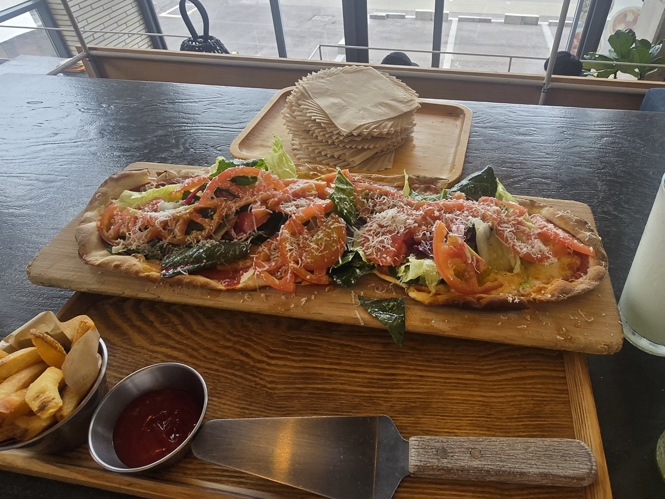 그래서 토마토 샐러드 피자와 프렌치프라이까지 주문했습니다.